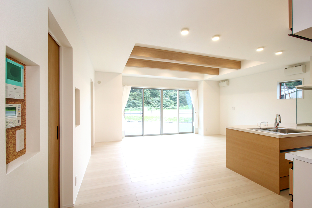 リビングは折り上げ天井×梁で空間に立体的な奥行きと高い開放感を与えます。間接照明との相性も良く、住まいに高級感を演出します。