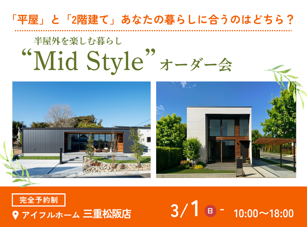 | タイトル | 平屋と2階建てあなたの暮らしに合うのはどちら?Mid Styleオーダー会 |
