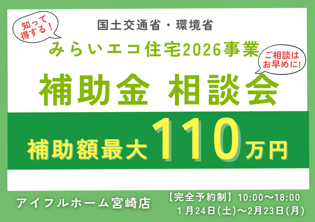 | タイトル | 【知って得する! 補助金最大110万円活用!】みらいエコ住宅2026事業 相談会▶国富展示場 |