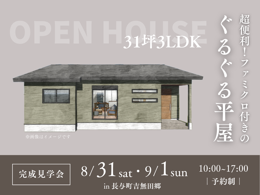 | タイトル | 《長与町吉無田郷》超便利!ファミクロ付きのぐるぐる平屋【完成見学会】 |