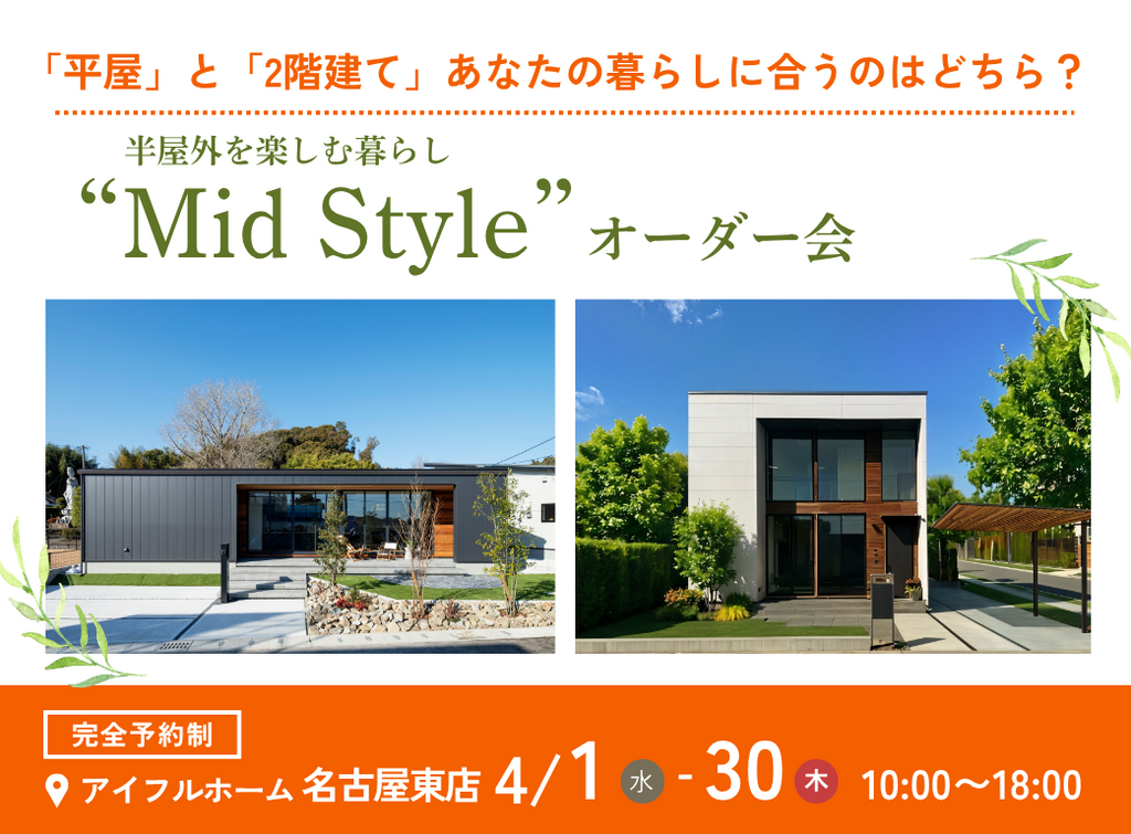 | タイトル | 【名古屋東店】平屋と2階建てあなたの暮らしに合うのはどちら?Mid Styleオーダー会 |