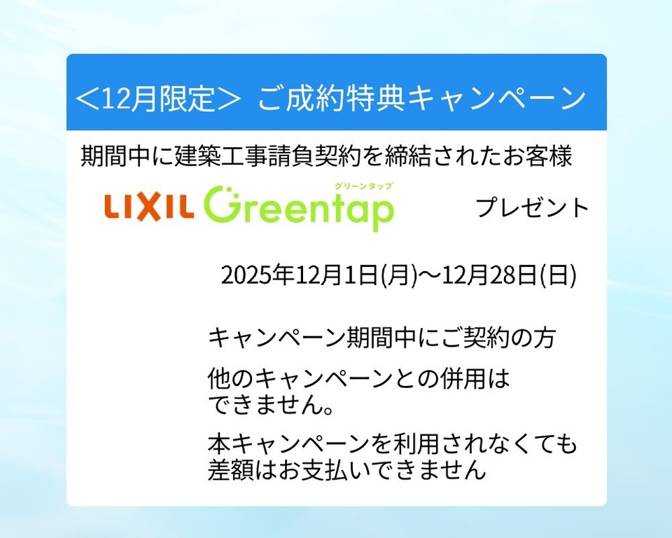 【大高展示場】12月限定成約特典 Greentapプレゼント
