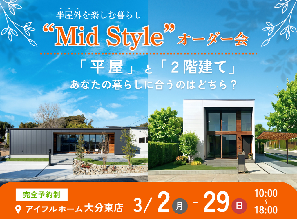 | タイトル | 【大分東店】平屋と2階建てあなたの暮らしに合うのはどちら?Mid Styleオーダー会 |