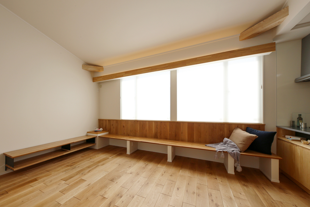 キッチンとランドリールームが隣り合っているため直結で行き来できるうえ、玄関→洗面所→ランドリー→LDK→玄関の回遊動線は帰宅した後も無駄なく動くことができます。スペースにも無駄がないので27坪4人家族でもゆとりのある住まいを実現しました。