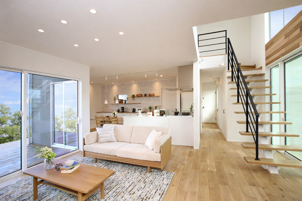 吹抜けのあるLDKに採光性の高いシースルー階段を組み合わせることで、より明るいリビングをご提供いたしました。シースルー階段に黒のアイアン手摺を組み合わると空間のアクセントになりおしゃれで洗練された雰囲気を演出します。