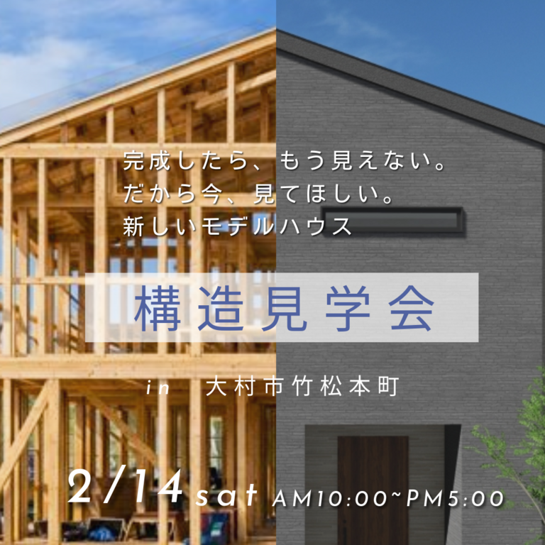 大村市竹松本町に新しく誕生する建売モデルの構造見学会を開催します。これまでにない快適さと効率の良さを備えた新しい住まいを、今だけ内部構造から細かな仕様まですべてご覧いただけます。