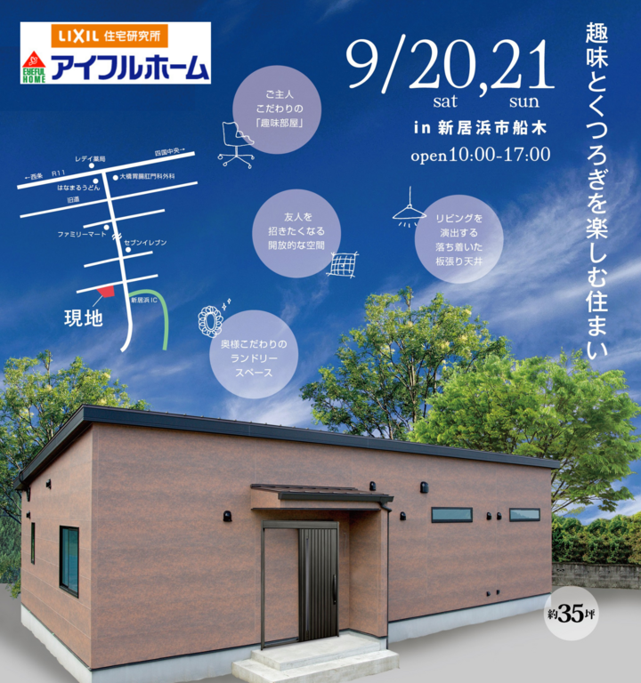 | タイトル | 【新居浜市船木】趣味とくつろぎを楽しむ平屋 ≪完成見学会≫ |