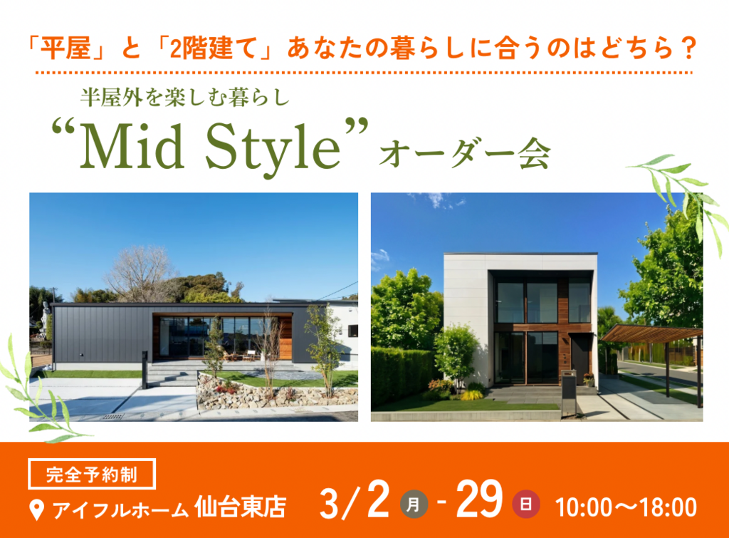 | タイトル | 【仙台東店】平屋と2階建てあなたの暮らしに合うのはどちら?Mid Styleオーダー会 |