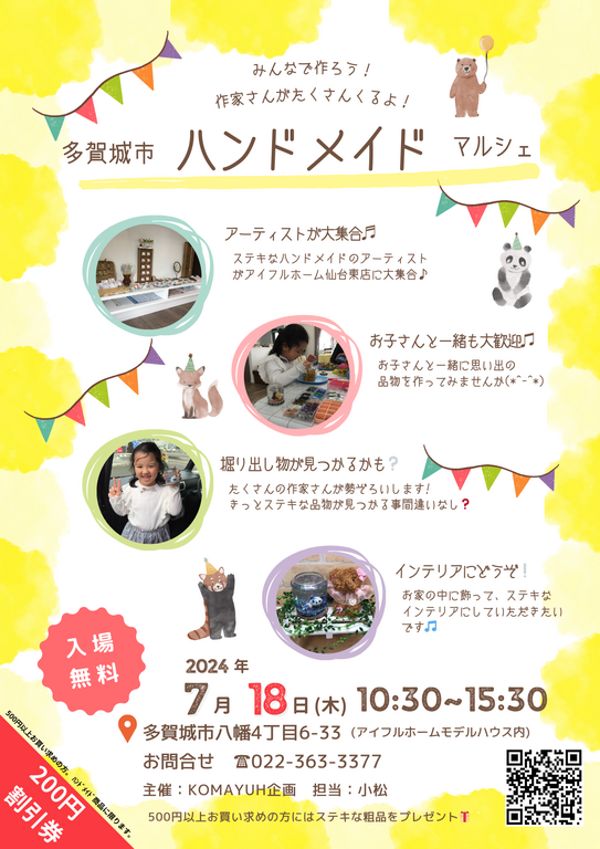多賀城市で行われるこのイベントでは、手作りのステキな品物がたくさん集まる予定です❕