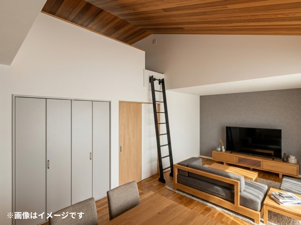 平屋の概念を覆す、20帖超の大空間LDKが誕生しました。 見上げれば吹抜けとつながる勾配天井。その先には、大人も子供もワクワクす「秘密基地のようなロフト」が広がります。