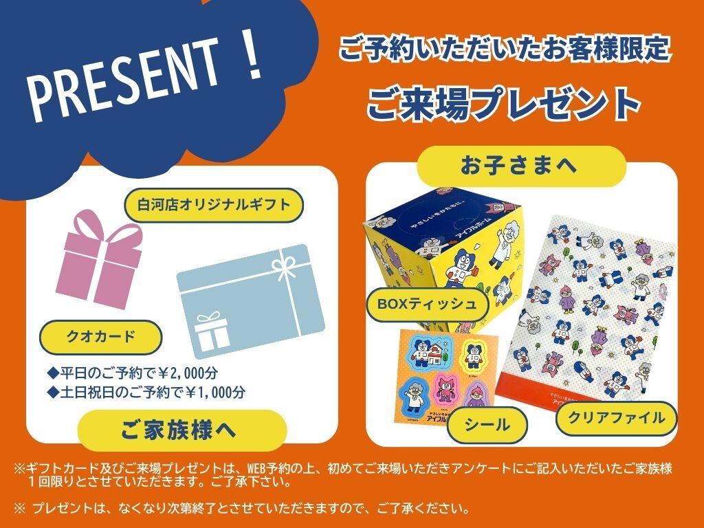 ※ギフトカード及びご来場プレゼントは、WEB予約の上、初めてご来場いただきアンケートにご記入いただいたご家族様1回限りとさせていただきます。ご了承下さい。