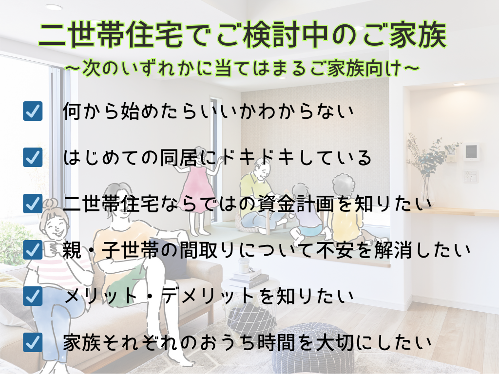 この相談会では、家づくりのプロが二世帯住宅のメリットやデメリット、設計のポイント、資金計画について詳しくお話しします。
