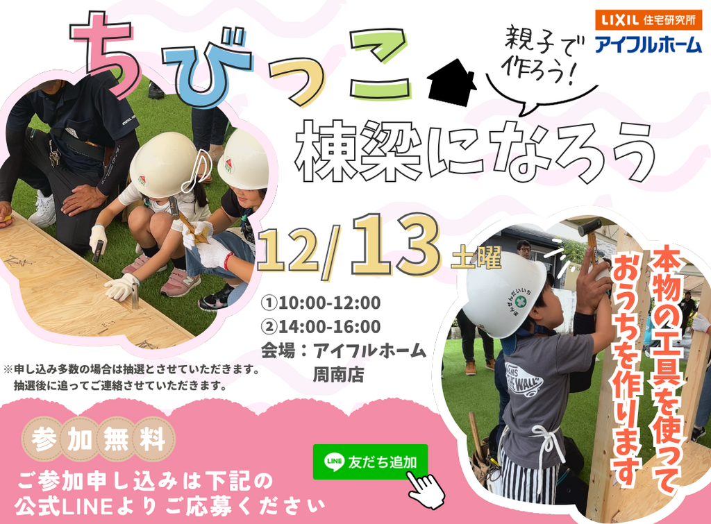 | タイトル | 【体験型イベント】ちびっこ棟梁になろう<アイフルホーム周南店下松展示場> |