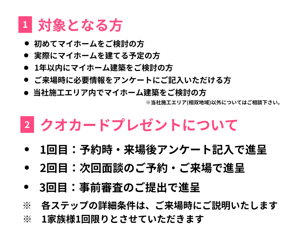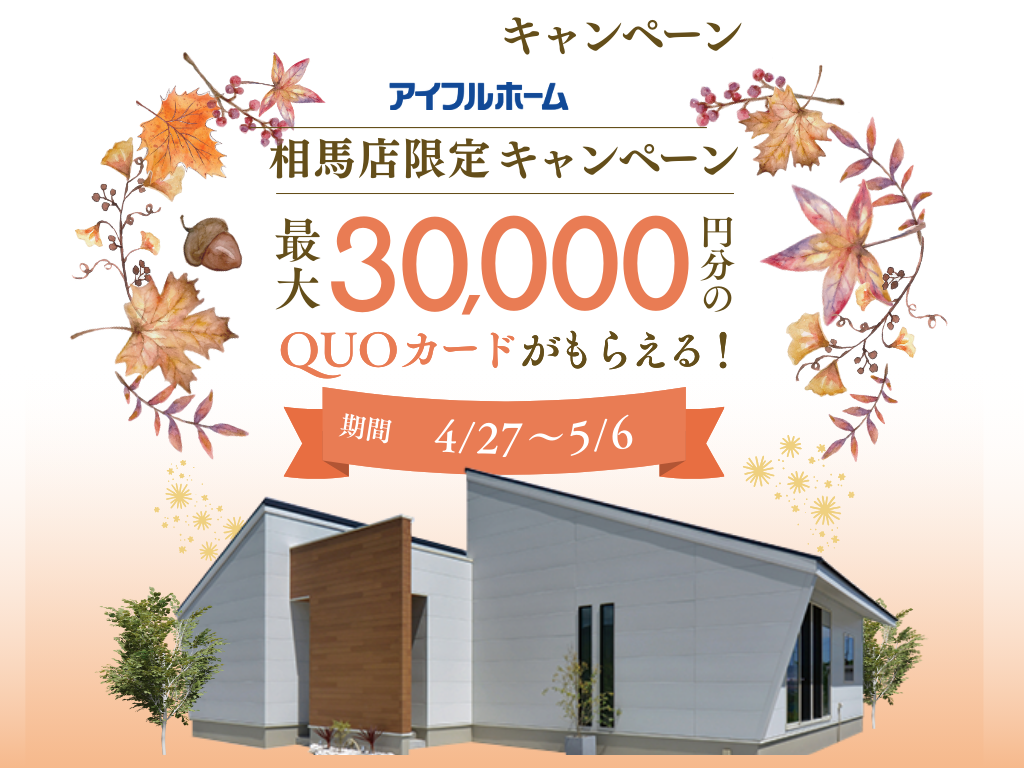 | タイトル | 【相馬店限定】※相馬エリア※最大30,000円分のクオカードがもらえる!新築応援キャンペーン |