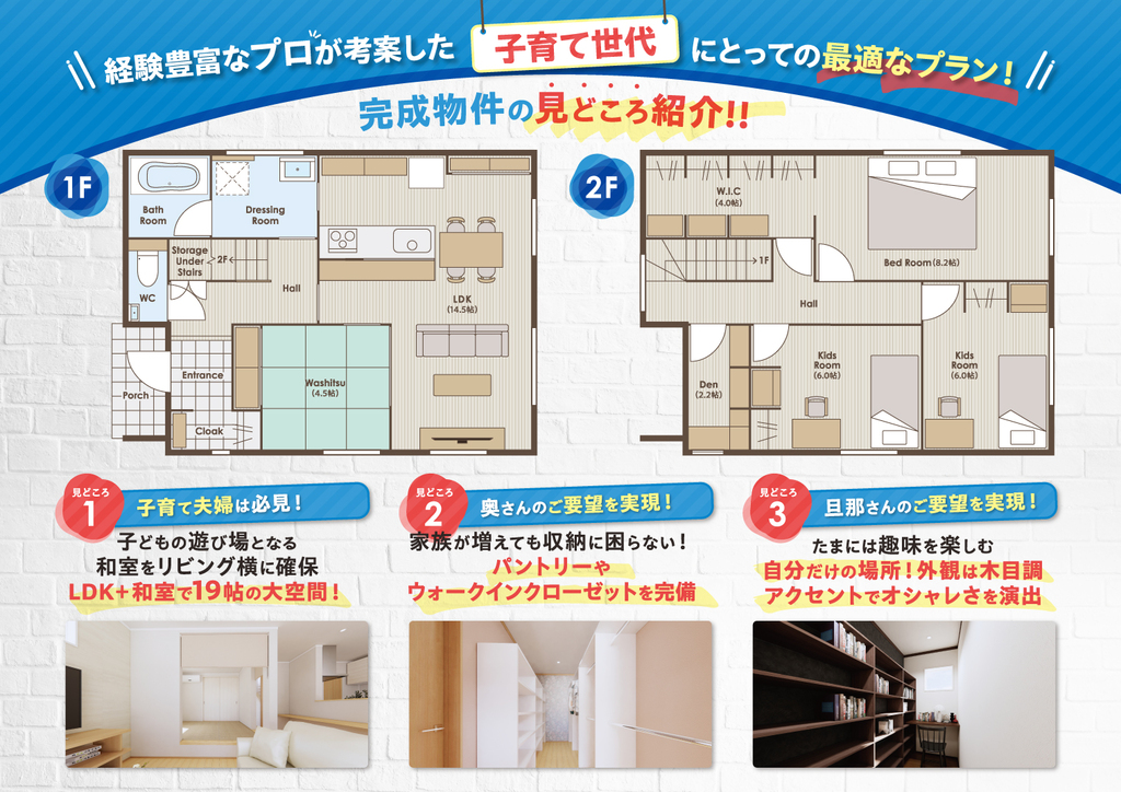 子どもが産まれて一番困るのは収納スペース。大きくなるにつれて、遊び道具や衣服は増えていくため、ウォークインクローゼットやシューズクロークを確保しています。また、食事の量が増えてくると買い物も大変になってくるため、食料品などをストックできるパントリーがあれば買い物に行く回数を減らす事も出来ます。もちろん、家事動線もコンパクトにまとめています。