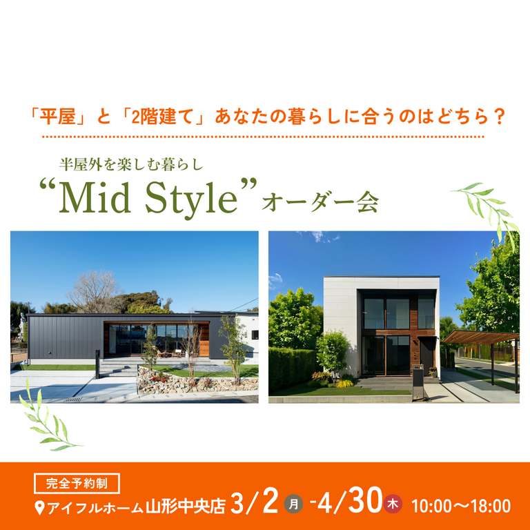 | タイトル | 【山形中央店】平屋で叶える!内と外が曖昧につながる理想の暮らし″Mid style″オーダー会 |