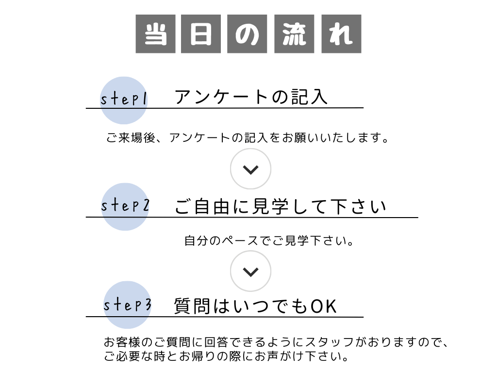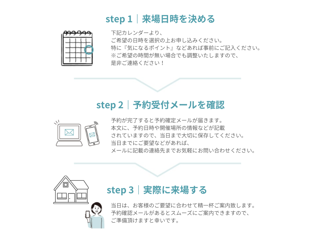、来場予約を受け付けています。当日は、デザインのこだわりや、家族の成長に合わせた間取りの提案、お家づくりにまつわるお悩みや疑問について、専門スタッフがお答えいたします。また、お客様のご要望に合わせたプランの提案も可能です。
