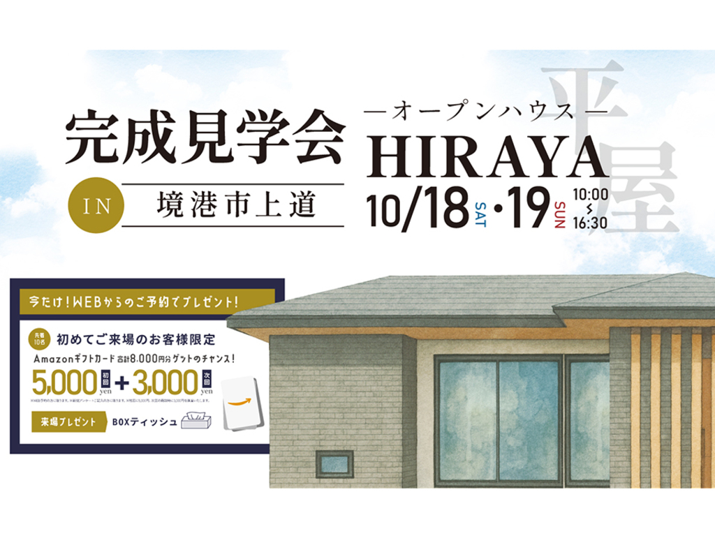 タイトル | 完成見学会 in 境港市上道 ーオープンハウスー HIRAYA 10/18・19 |