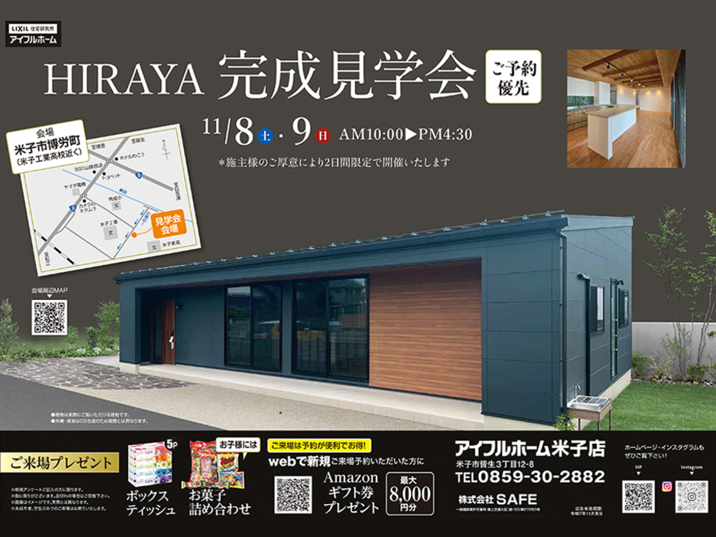 | タイトル | 11/8.9【米子市】HIRAYA 完成見学会 ミッドテリアでつなぐ新しい平屋の暮らし方 |
