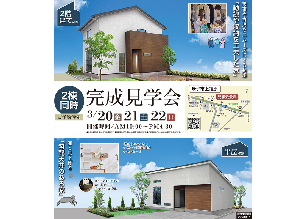 3/20.21.22【米子市上福原】2棟同時・完成見学会<平屋・2階建て>(猫壁/収納)