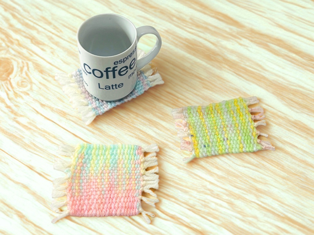 段ボールでできた「おり機」を使って、毛糸を編み込みながらコースターを制作します。