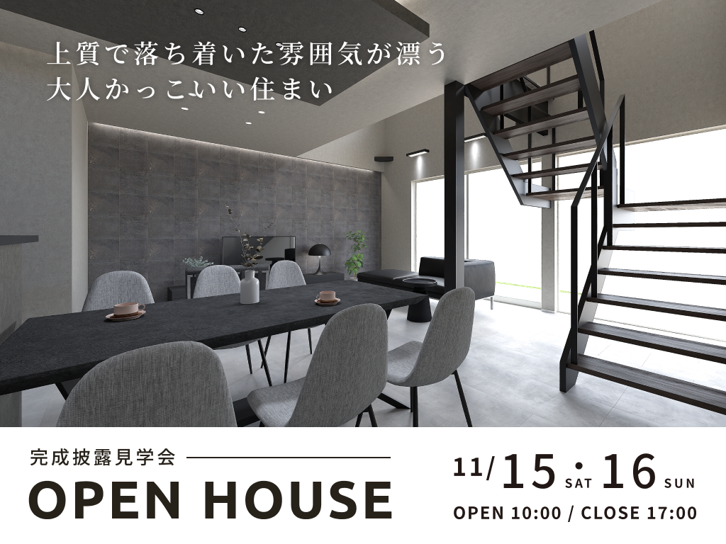 タイトル | 完成見学会 | 上質で落ち着いた雰囲気が漂う、大人かっこいい住まい。 |