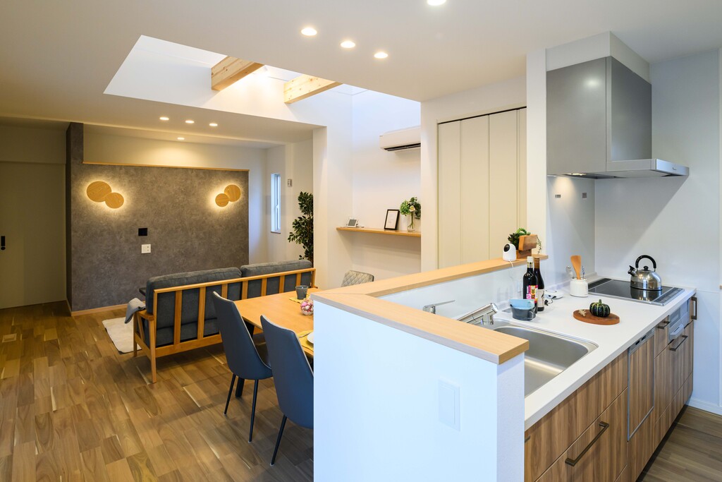 キッチンからはリビング全体が見渡せて、家族の気配をいつも感じられる安心感があります。