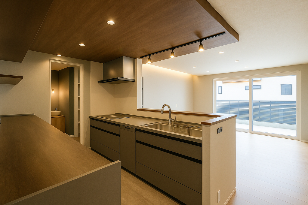 キッチンを中心にぐるりと回れる回遊動線で、調理・洗濯・片づけの行ったり来たりを最短化。