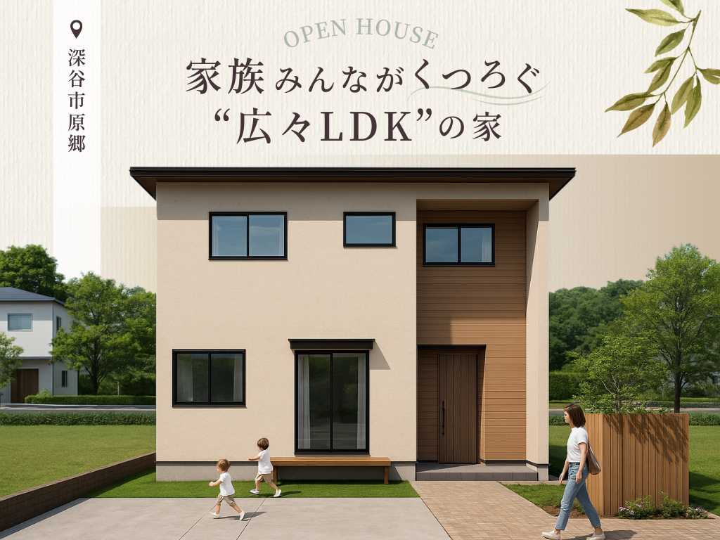 | タイトル | 【深谷市原郷】家族みんながくつろげる、心地よい大空間リビングのある家 完成見学会 |
