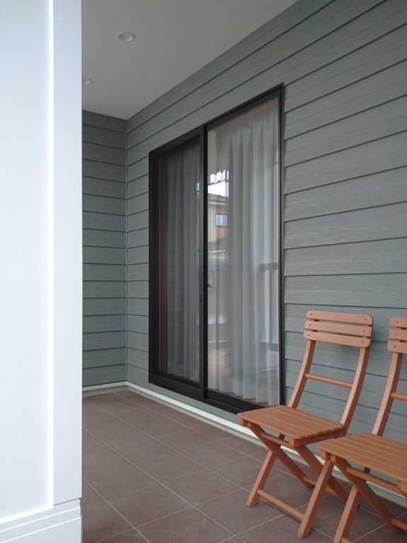 横張のラップサイディングが特徴的な外観とテラス