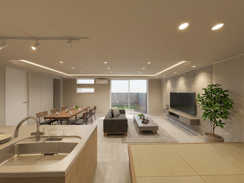 木造トラス構造が可能にした「6.5mの無柱空間」が、20帖超のLDKに圧倒的な開放感をもたらします。天井を彩る間接照明の柔らかな光は、まるで高級ホテルのスイートルーム。
