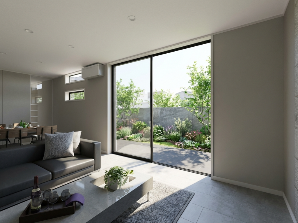 大開口の窓を開ければ、リビングとテラス、そして庭がひとつに繋がり、内と外が溶け合う開放感を体感できます。