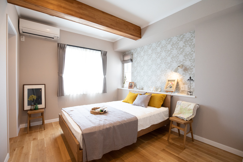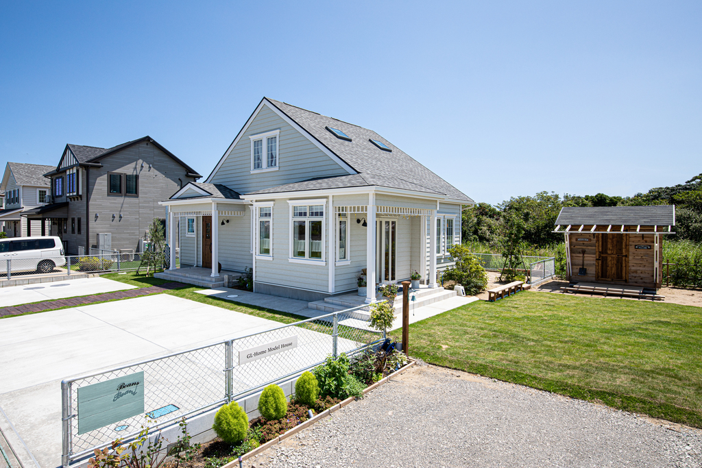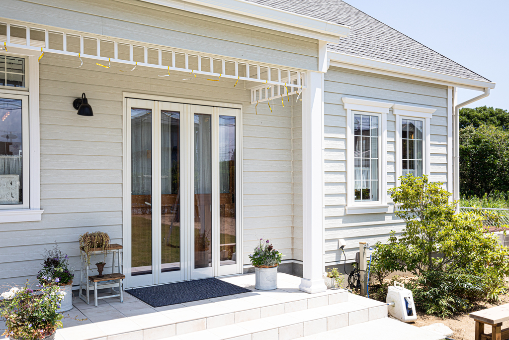 ラップサイディングの外壁が、上品で洗練された印象を与え、白い壁面に切妻屋根(きりづまやね)やカバードポーチ、ドーマー風の小窓が絶妙に調和しています。これらのディテールは、洋風住宅のエッセンスを巧みに取り入れ、時間を超えて愛されるデザインを実現しています。