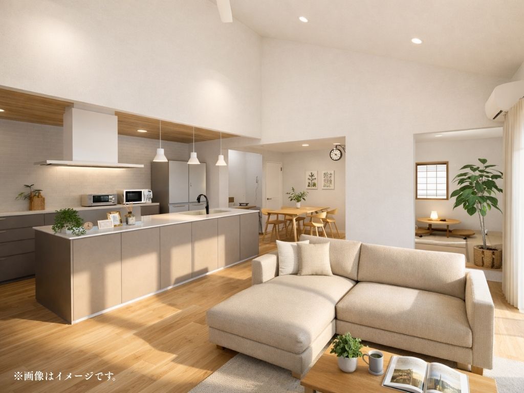 白を基調に、オークの明るい木目を合わせた淡い色合い。そこに、必要な場所に必要な灯りを配した照明計画が重なり、光と影のコントラストが空間に奥行きを生みます。落ち着くのに、のびやか。家族が自然と集まり、ふっと肩の力が抜ける。そんな空気感を、ぜひ現地で確かめてください。