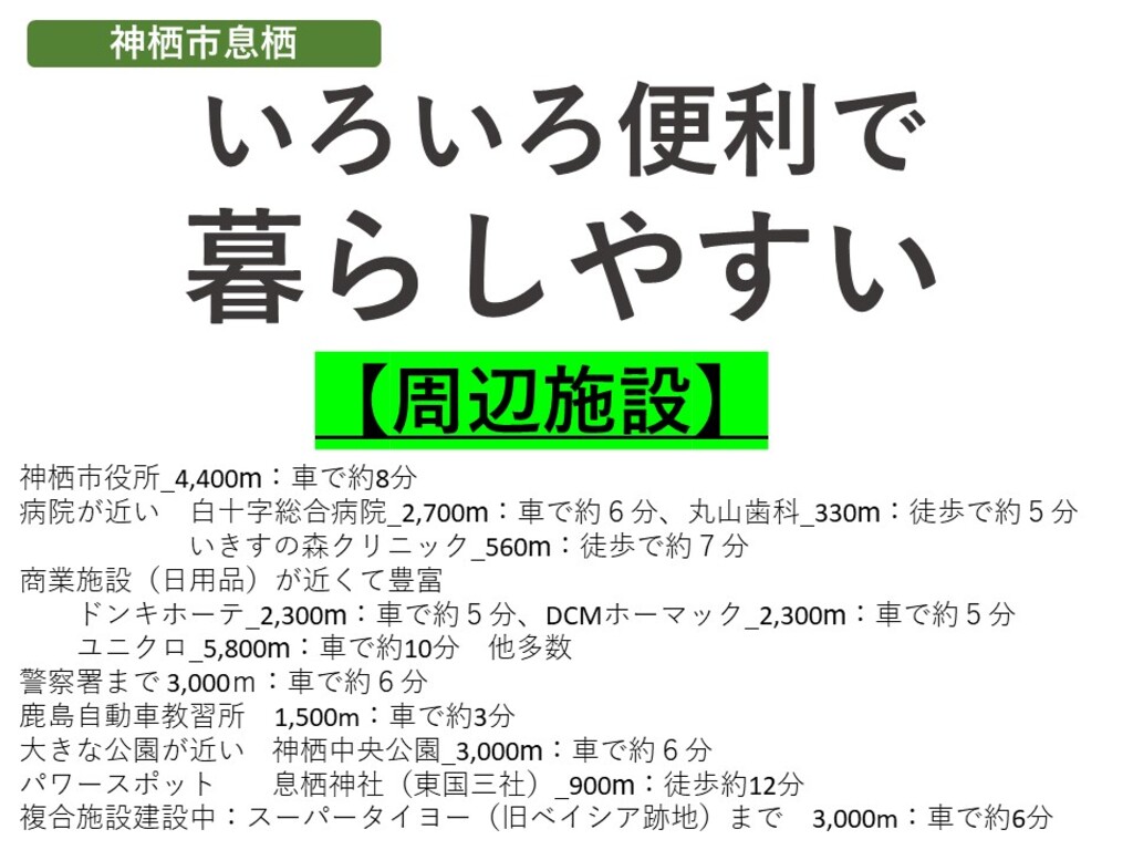 病院                         白十字総合病院_2,700ⅿ:車で約6分、丸山歯科_330ⅿ:徒歩で約5分    いきすの森クリニック_560ⅿ:徒歩で約7分