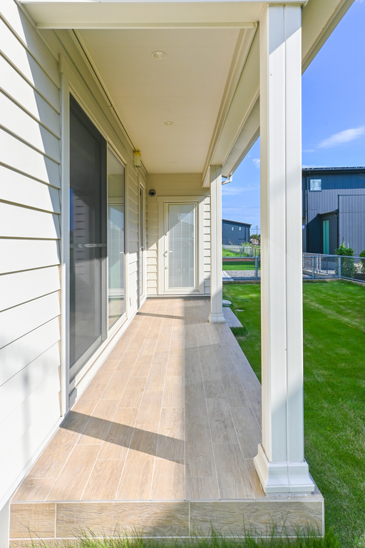 家と庭をつなぐカバードポーチが特徴的なデザインのモデルハウスです。広々としたリビングと開放感のある勾配天井は、一階とニ階をギャラリースペースでつなぎ、場所や向きあうものが違っても家族の距離感が程よく保てる空間を演出しています。子育て世代のリアルな家の使い方、そして子育て後の未来を見据えた、日本の暮らしの便利さと、アメリカンスタイルの豊かさを掛け合わせたアーリーアメリカンスタイルのモデルハウス。