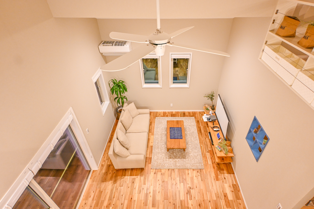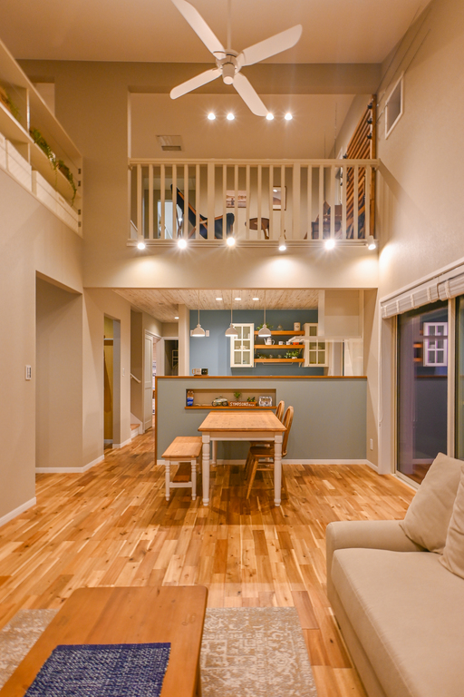 1.5階の使い方として、今は2階は子どもたちの空間として利用し、将来的に子どもたちが巣立った後には、広すぎず狭すぎず、使いやすい小部屋とギャラリーとして利用できます。趣味のワークショップとして利用するのも◎。生活空間は一階で完結できる間取りとなっているので、階段が億劫になるお年頃になっても無理をすることもありません。