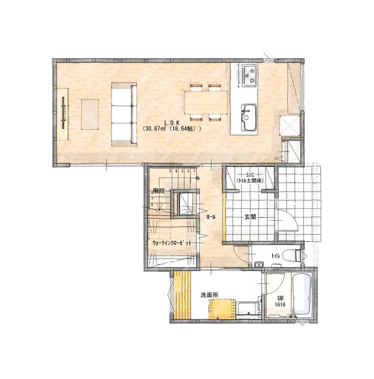 この間取りの最大の特徴は、1階のホール・洗面所近くに配置された大型のウォークインクローゼット(WIC)です 。 通常は2階に配置されがちな衣類収納を1階に集約することで、重い洗濯物を持って階段を上がる必要がなくなり、朝の身支度も1階で完結。「家事ラク」をデザインで解決した、忙しい共働き世代に最も刺さるポイントです。.jpg)