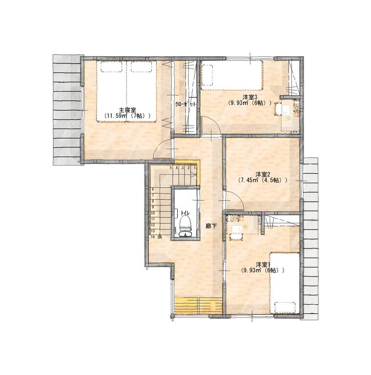 2階には、主寝室(7帖)、洋室(6帖×2室)、**洋室(4.5帖)**の計4部屋を配置 。35坪という限られた面積の中で、家族4人がそれぞれのプライベートな時間を持てる設計は、全国のハウスメーカーでも非常に人気のある構成です。 ほとんどの部屋に収納が完備されており 、高性能な住環境だからこそ実現できる「どこにいても快適な個室空間」を体感いただけます。