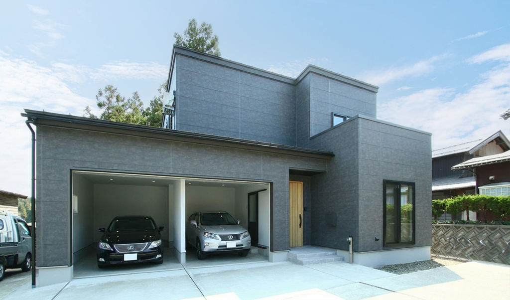 重厚感あふれるブラック一色の外観に、お施主様の憧れだったインナーガレージを組み込んだ一棟。