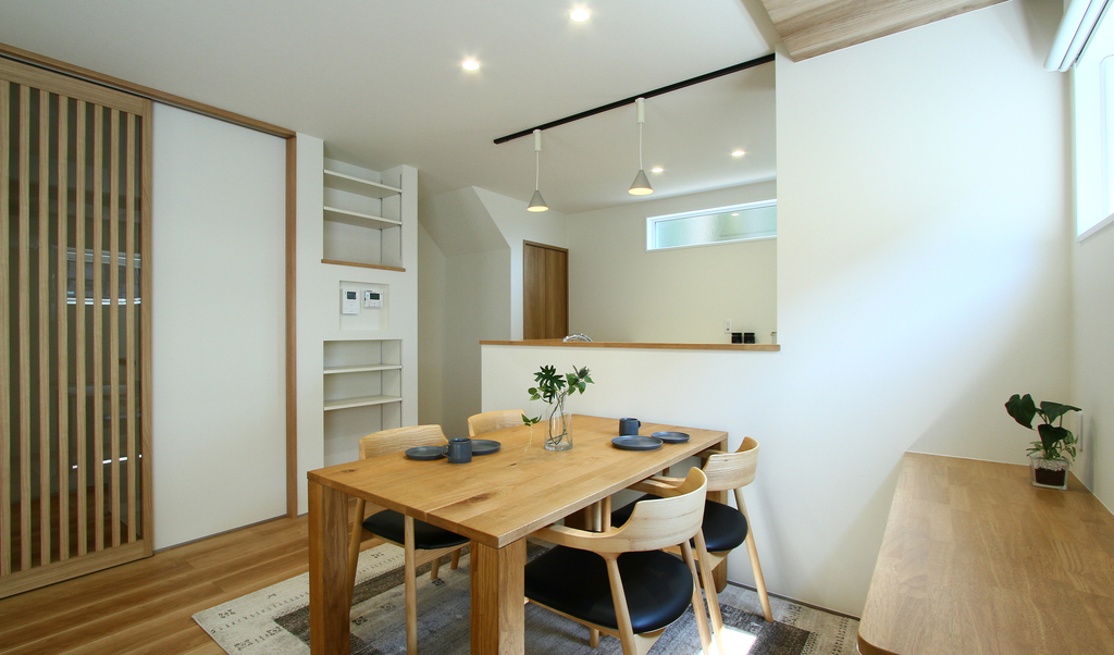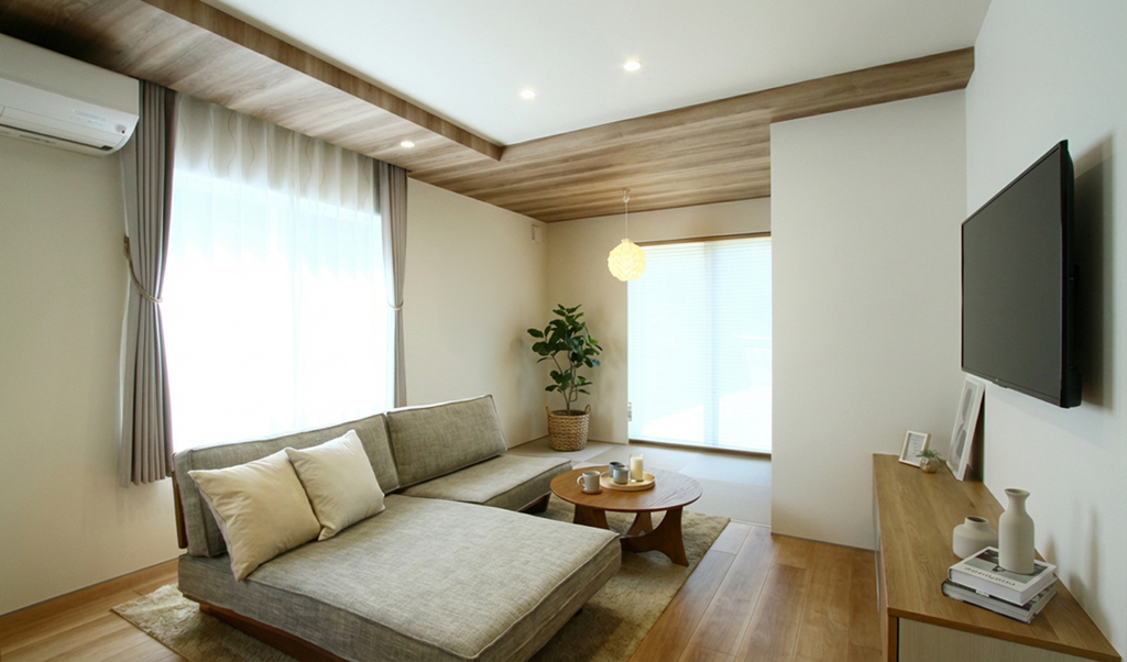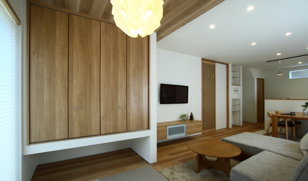 格子の引き戸を採用し、現代的な暮らしの中に和のニュアンスを調和させたLDK。また、リビングに隣接する3帖の畳コーナーは、お施主様が最もこだわられた場所の一つ。
