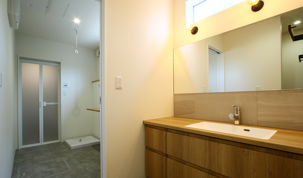 洗面室とランドリールームを横並びに配置しました。誰かが脱衣や洗濯をしていても気兼ねなく洗面台を使うことができ、ランドリールームでは「洗う・干す・たたむ」の工程をその場で完結できます。