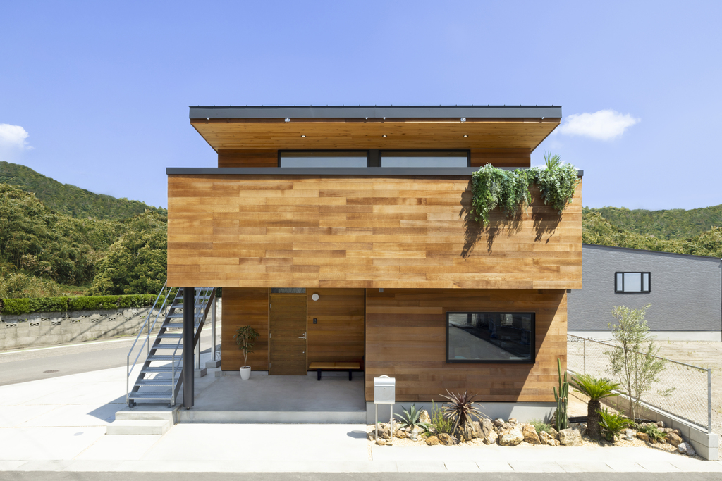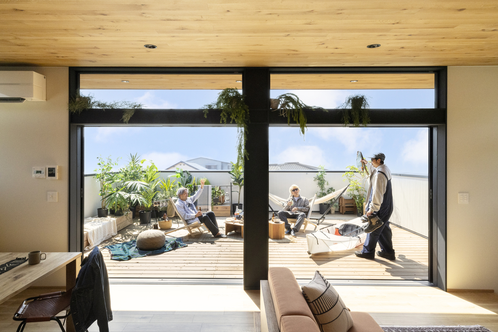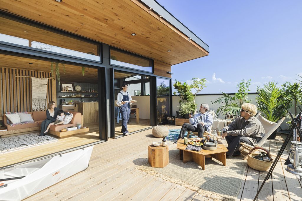 大開口から眺めるアウトサイドリビングが、屋内の開放感まで高める。