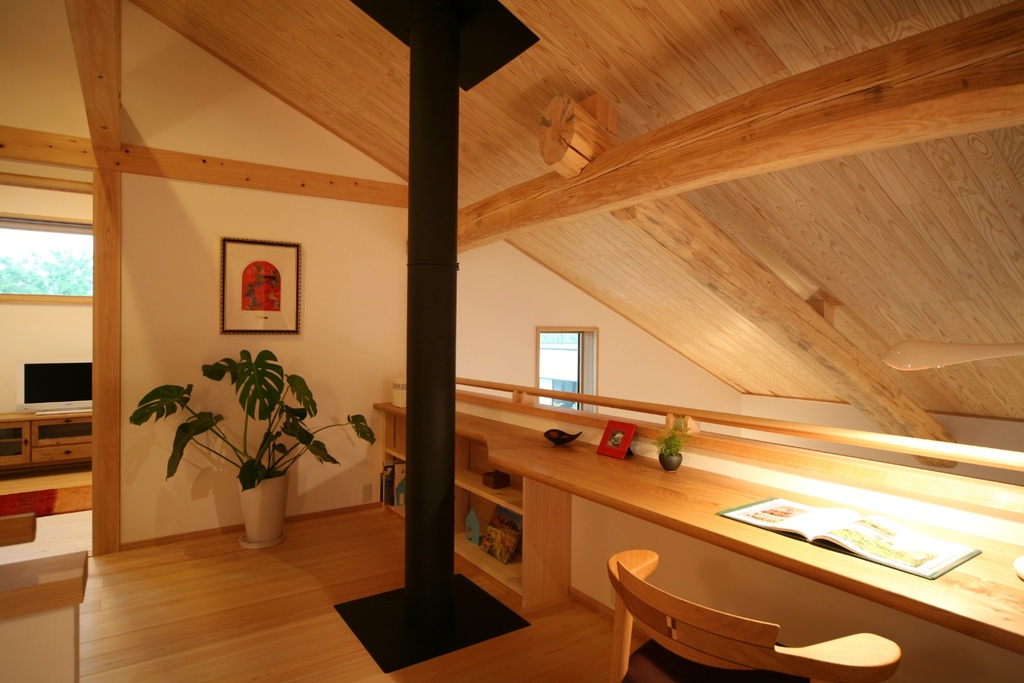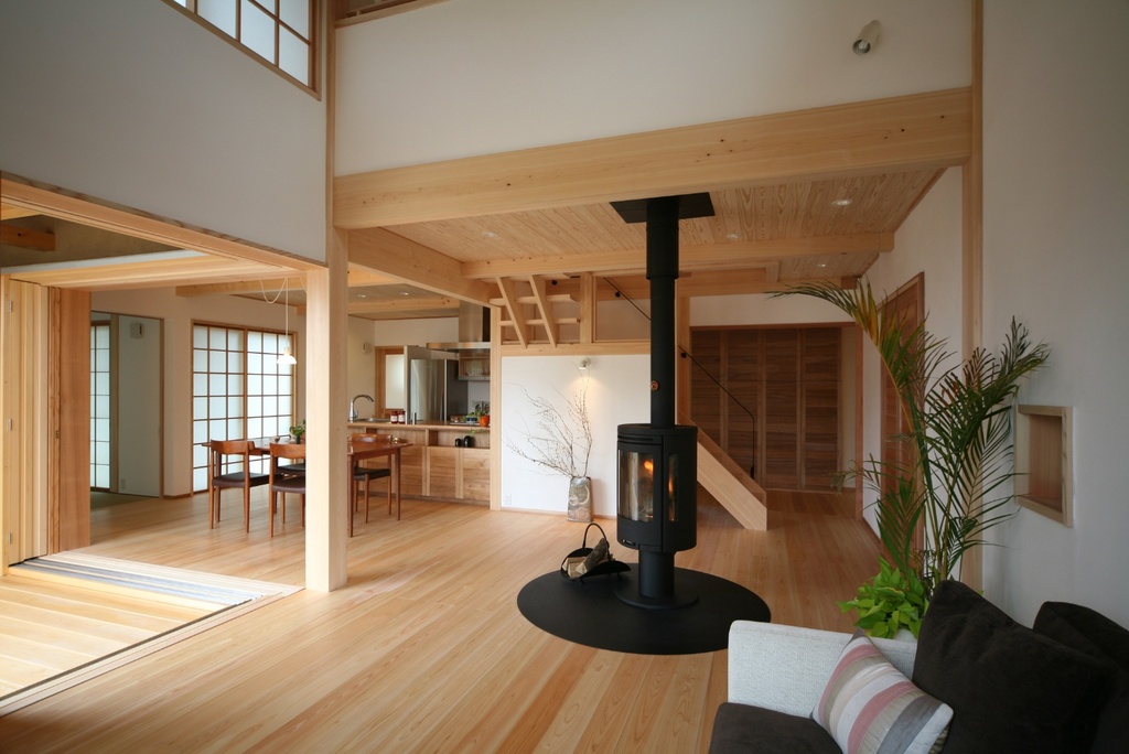ダイナミックな丸太梁が支える木の質感たっぷりの住まい