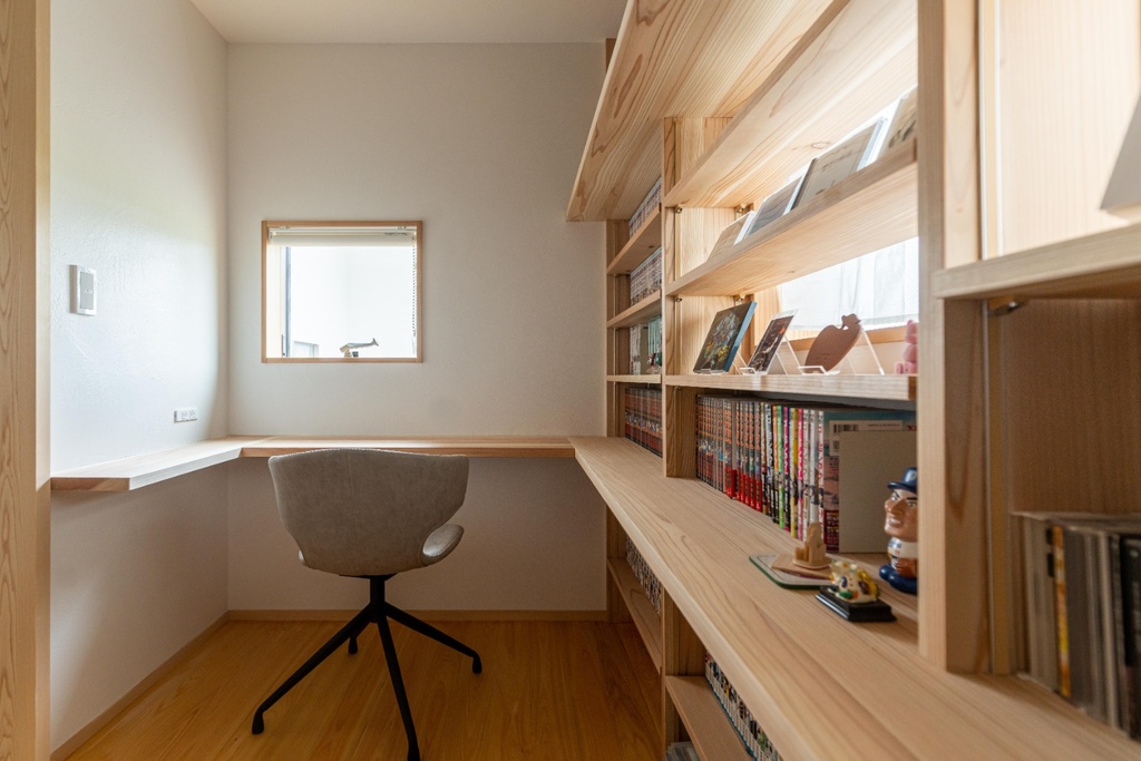 居室の奥におこもり書斎コーナー。読書をしたり、趣味の物をたくさん飾って自分だけの特別な空間に。