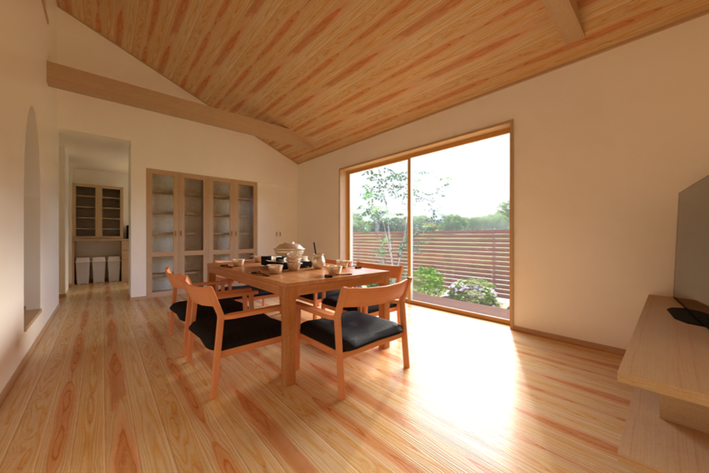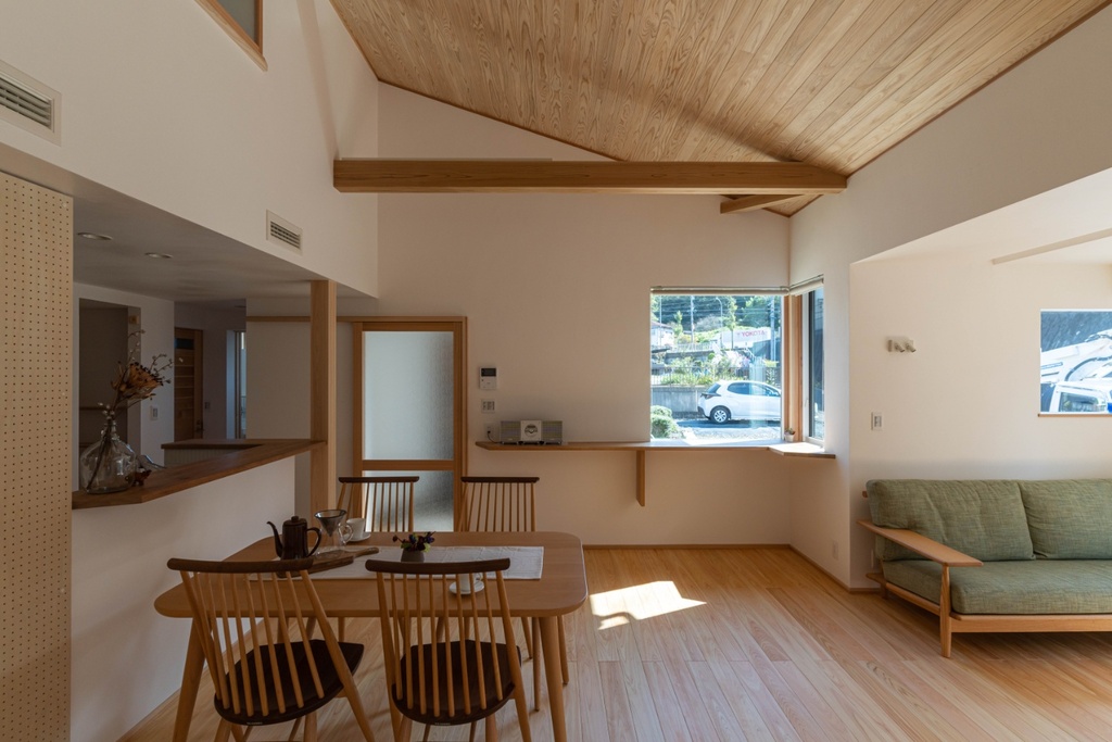 屋根の傾斜を活かした勾配天井のリビングは平屋ならでは。