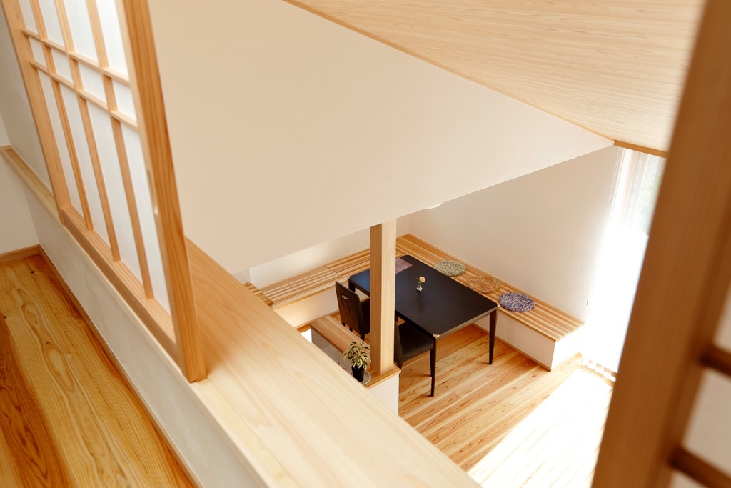 くつろぎの間を見下ろせる場所に、ちょっとしたロフトスペース。仕事終わりに一人で休むときの場所としても。