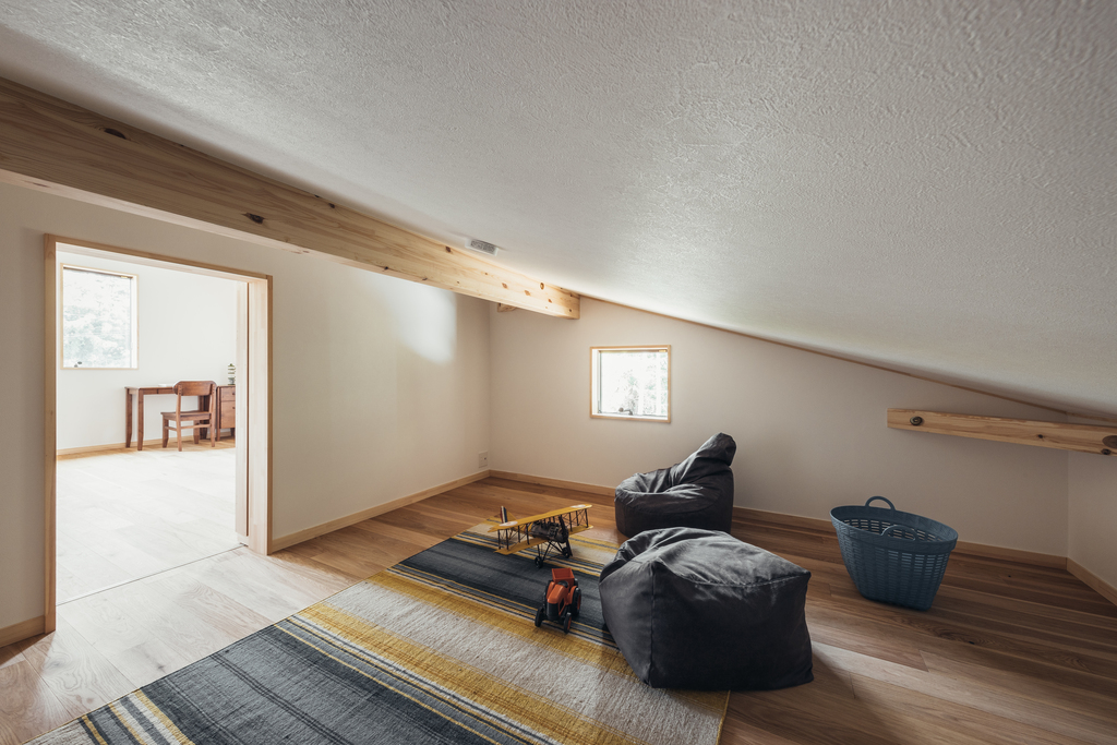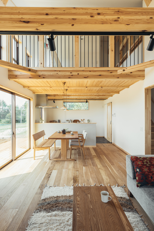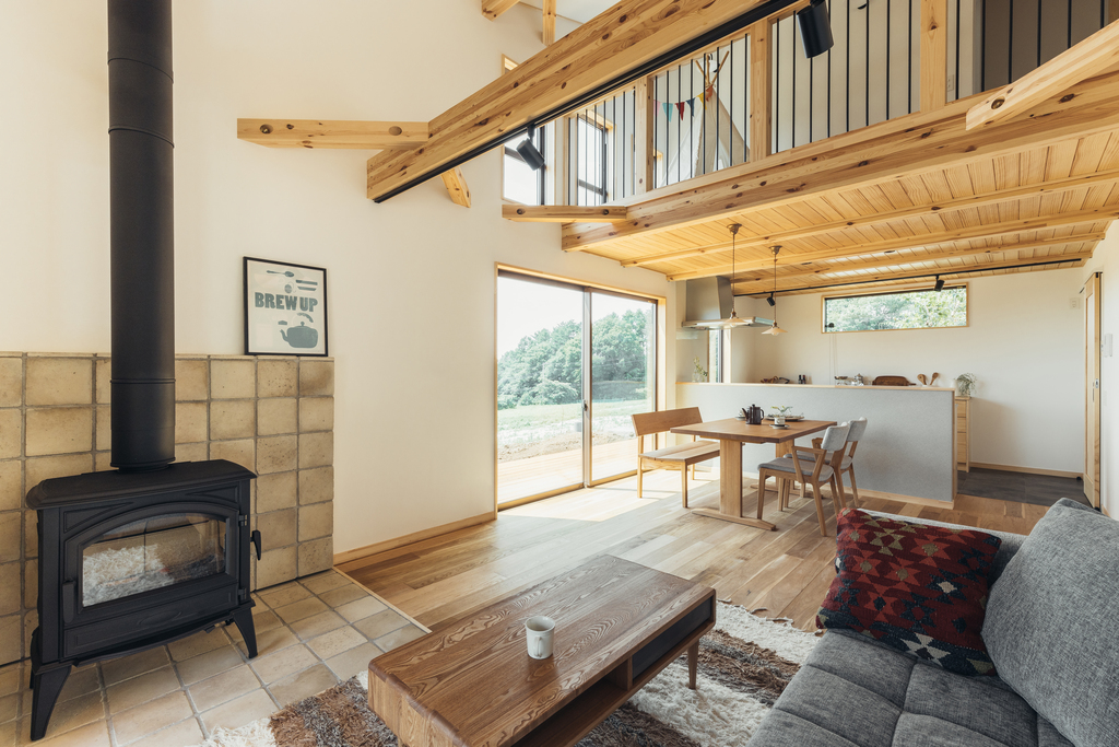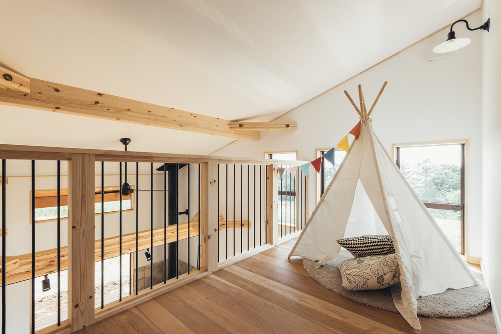 平屋暮らしの魅力を取り入れたロフトハウスのような2階建て。1階と2階を緩やかにつなぐリビングの吹抜けとフリースペース、趣味に収納に多目的に使える小屋裏部屋、広々としたウッドデッキなど平屋だけでは収まらない『+α』の魅力があふれる住まいです。