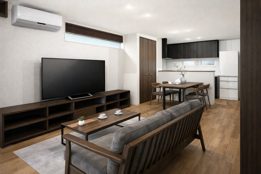 やわらかな木の質感と、落ち着いたトーンで統一されたLDK。