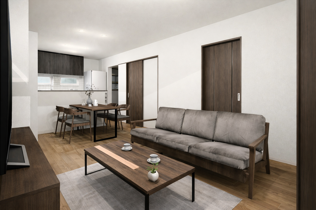 ダイニングとリビングが緩やかにつながり、家族の会話が生まれやすい住まいです。